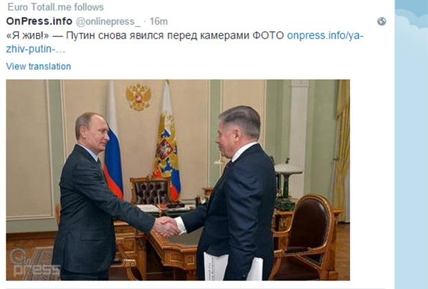 MOSKVA - Zapadni mediji dižu prašinu tvrdeći da se nešto strašno ili makar ćudno dešava s predsednikom Rusije Vladimirom Putinom jer se od 5. marta navodno nije pojavljivao u javnosti, ali upravo sada po Tviteru je počela da kruži vest s fotografijom da se u svojoj rezidenciji Novo-Ogarjovo kraj Moskve sastao sa predsednikom Vrhovnog suda Vjačeslavom Lebedjevim.
