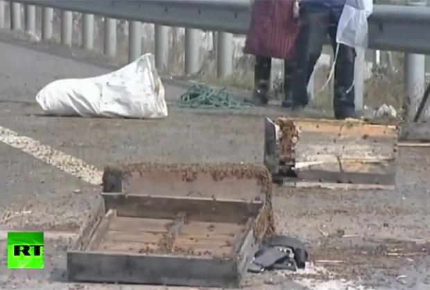HANGDŽOU - Milioni vrlo ljutih pčela začas su raščistile saobraćaj na auto-putu u kineskoj provinciji Džeđang, a na slobodi su se našle kad su im košnice ispale iz kamiona zbog sudara.