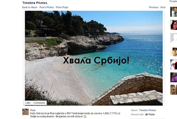 "Kažu Srbi da im je Pula najdraža u RH? Naši brojevi kažu da vas ima 1,668 (7,71%) iz Srbije na našoj stranici - Broj jedan od svih država!", stoji u potpisu fotografije na kojoj je ćirilicom ispisano "Hvala Srbijo!"
