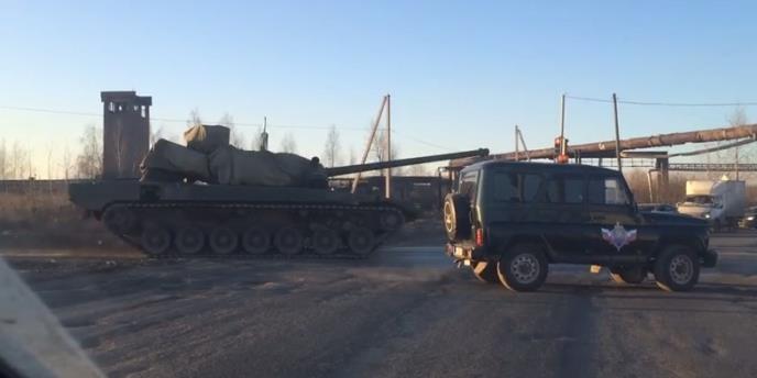 Potpuno nov tenk snimljen je prilikom transporta vozom na poligon izvan Moskve, uoči obeležavanja Dana pobede 9. maja, na Crvenom trgu u Moskvi.