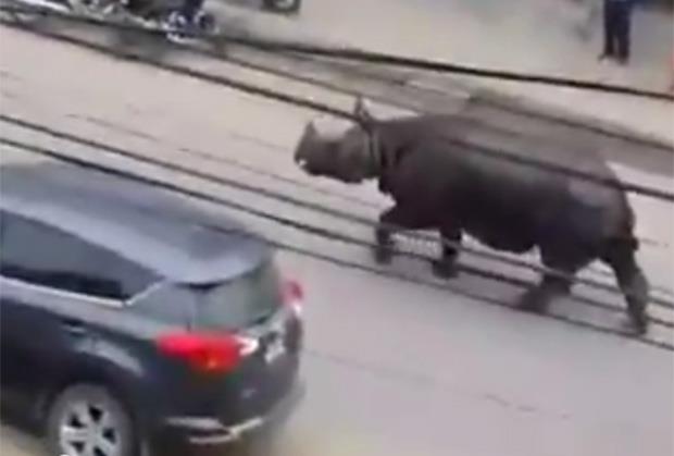 Ram Prasad Tapalija rekao je da je nosorog ušao u grad Hetaudu, oko 80 kilometara južno od Katmandua, i da je napadao građane, dok su ljudi pokušavali da ga isteraju iz grada trubeći automobilskim sirenama i udarajući u bubnjeve.