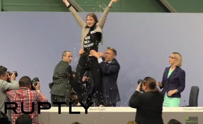 Devojka je uzvikivala: "Zaustavite diktaturu Evropske centralne banke".