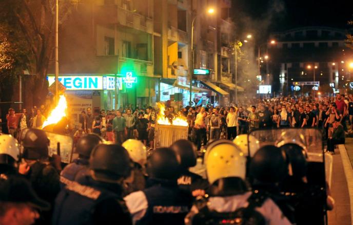 Uzvikujući "ubice, ubice" i tražeći ostavku premijera Nikole Gruevskog demonstranti su bacali kamenice i polomili prozore na zgradi vlade, polupali nekoliko policijskih vozila i zapalili nekoliko kontejnera.