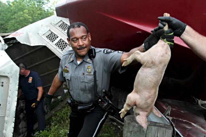 Prasići su napravili čitavu strku na putu na kojem je i saobraćaj bio zaustavljen jer ih je nekoliko stotina pobeglo iz prevrnutog kamiona.