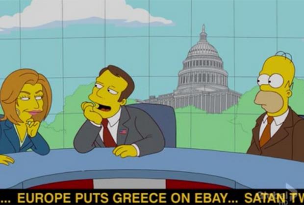 Ovaj popularni crtać predvideo je mnoge svetske događaje i pre nego što je iko slutio da bi se to moglo desiti, a ni grčka finansijska kriza nije izmakla njihovom "vizijama". U epizodi "Politički nekorektni sa Homerom Simpsonom" (Politically Inept, with Homer Simpson") iz januara 2013. Homer gostuje u studiju televizije Fox News, a među vestima koje se emituju u njuz baru je "Evropa prodaje Grčku na Ibeju".