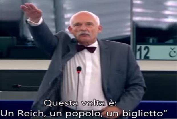 BRISEL - Poslanik poljske Nove desne stranke Januš Korvin-Mike ustao je usred Evropskog parlamenta i nacističkim pozdravom salutirao da bi evroposlanicima pokazao šta misli o predlogu Nemačke da se na nivou Evropske unije izjednače cene voznih i autobuskih karata.