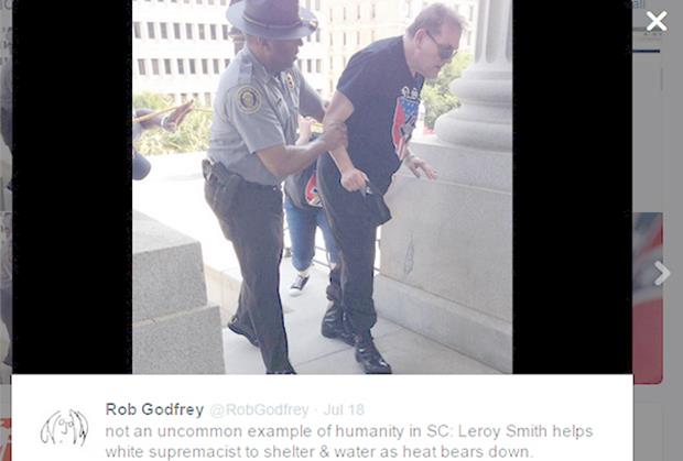 Rasisti su protestovali zbog odluke vlasti da se zastava Konfereracije, robovlasničkog Juga iz vremena američkog Građanskog rata, ukloni sa zgrade Kongresa u Kolumibiji, glavnom gradu američke savezne države Južne Karoline. Jednom od vremešnih klanovaca je pozlilo od vrućine, a crni policajac Liroj Smit mu je pomogao. Fotografiju je snimio Bob Godfri, pomoćnik givermera Južne Karoline.