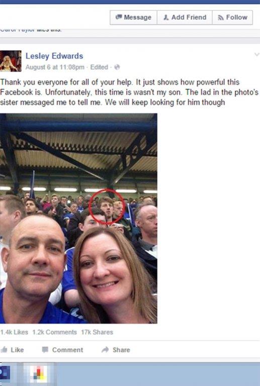 Lesli Edvards (54) je na selfiju koji s utakmice Čelzija na Stamford bridžu u publici videla muškarca koji je isti njen sin Džon Anderson Edvards (31). Sa sinom se poslednji put čula u septembru prošle godine, kad joj se javio iz portugalskog grada Lagosa, gde je trebalo da počne da radi kao kuvar.