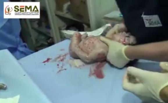 إصابة امرأة حامل وإصابة الجنين (طفلة) في بطنها.النظام المجرم يحاول إيقاف الحياة في مدينة حلب .صاروخ جو - ارض أطلق على بناء سكني في حي الأنصاري أدى إلى إصابة كامل العائلة ، بين المصابين امرأة حامل .الطاقم الطبي في المشفى كان جاهز للتعامل مع الحالة وتم إخراج الجنين بعملية قيصرية ، وكان الرحم مصاب بشظية مستقرة في أعلى الحاجب الأيسر للجنين والحمد لله العين سليمة تمت خياطة الحاجب والحمد لله الجنين وأمه في حالة جيدة ويتم متابعة علاجهم في المشفى.
