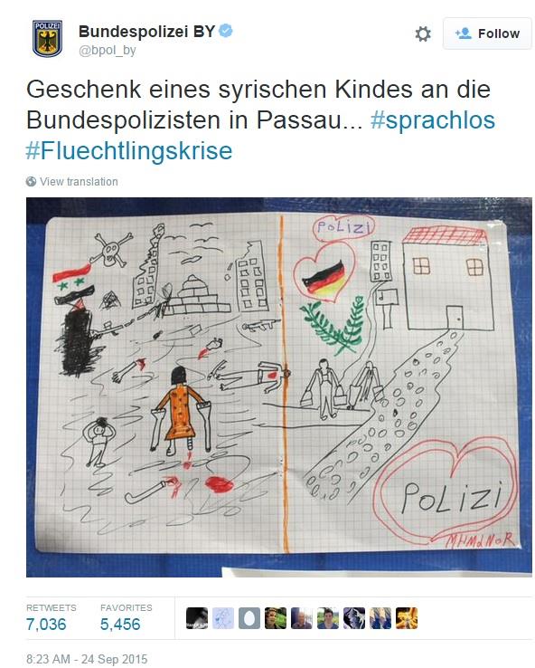 Bavarska policija je crtež objavila na Tviteru uz reči: 'bez teksta'. Crtež je na ovoj društvenoj mreži prosleđen više od 7000 puta.