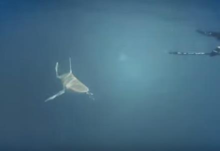 Snimak prikazuje dvojicu muškaraca kako s podvodnim puškama gledaju nekoliko morskih pasa, sve dok jedan nije krenuo pravo na njih