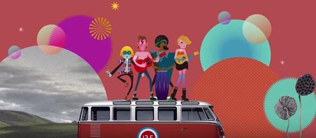 Četiri glavna lika u dekoru 1970-ih pojavljuju se na folksvagen kombiju, na lokvanjima i na velikom Kineskom zidu, a tu promiču i velika plastična patka i dinosaurus.