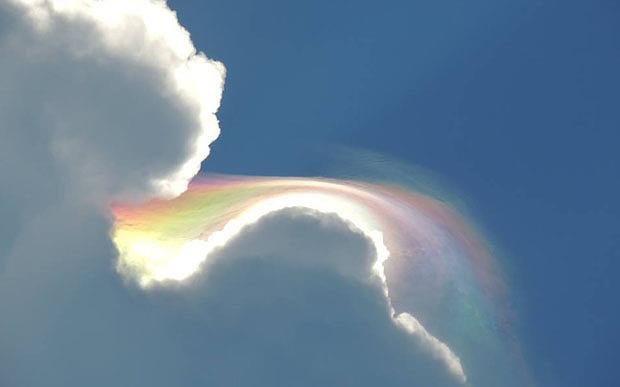 "Pogledala sam gore i videla ovo. Nikada ranije nisam videla tako nešto. Nisam znala šta je to. Pokazala sam gore i viknula ‘ O, Bože, pogledajte Sunce!’ Onda su ostali gosti hotela počeli da gledaju i fotografišu”, rekla je Beki. Ona je fotografiju sa Jamajke okačila na Fejsbuk stranu "The Weather Channel", a ubrzo su se javili i drugi koji su viđali i slikali neobične "dugine oblake." Ovi oblaci su poznati kao iridescentni oblaci, a sam fenomen koji im daje efekat kao da su obojeni duginim bojama, zove se iridescencija.Iako podseća na dugu, princip nastajanja ove pojave je drugačiji.