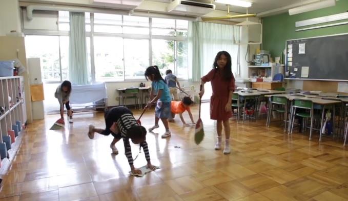 Deca u japanskim školama rade nešto što bi kod nas bilo krajnje nezamislivo - oni sami čiste svoju učionicu, metu i brišu podove, peru prozore, sami poslužuju hranu i nakon obroka peru posuđe.