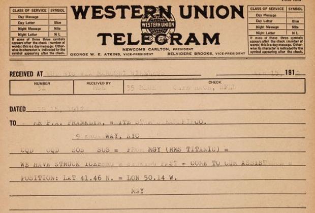 Svojevrsni telegram, koji će se uskoro naći na aukciji, poručivao je:“Udarili smo santu leda = Samo što nismo potonuli = Pošaljite pomoć. Pozicija: Lat 41.46 N. = 50.14 Lon.“
