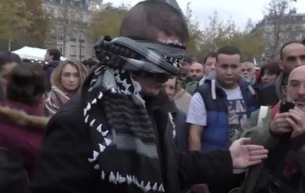 Mladić s povezom preko očiju je ispod svojih nogu stavio natpis "Ja sam musliman, ali mi kažu da sam terorista. Ja vama verujem, verujete li i vi meni? Ako da, zagrlite me".