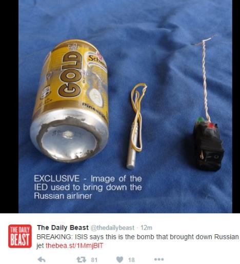 Na slici je prikazana limenka “švepsa“, kablovi i navodni uređaj za detoniranje, čime džihadisti žele da dokažu da su oni odgovorni za smrt 224 osoba.