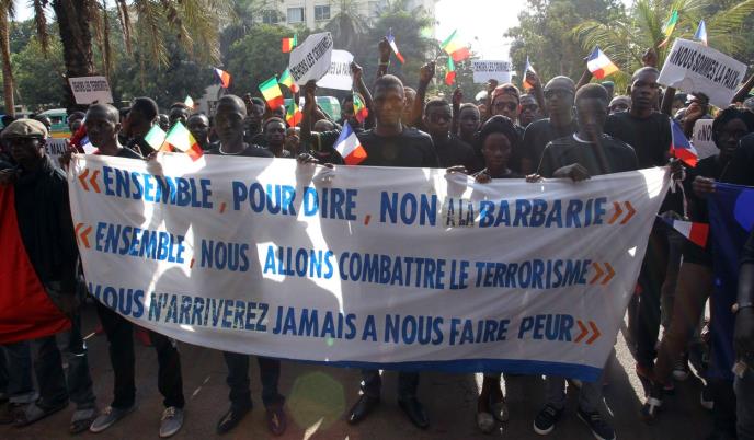 "Zajedno ćemo reći ne varvarizmu. Zajedno ćemo se boriti protiv terorizma. Nikada nas nećete uplašiti", bili su transparenti na protestu na kome je bilo i mnogo zastava Francuske i Malija.