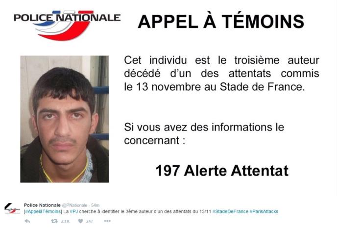 Francuska policija je na svom Tviter profilu fotografiju trećeg teroriste koji je učestvovao u napadima na Pariz, ali njegovo ime nije poznato