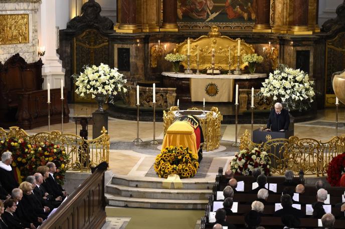 Stojeći pored Šmitovog kovčega, prekrivenog nemačkom zastavom i okruženom buketima suncokreta i belih ljiljana, Merkel je pozdravila nepokolebljiv stav koji je bivši kancelar pokazao tokom krvave kampanje krajnje levičarske Frakcije Crvene armije (RAF). "Ponovo smo suočeni sa stravičnim napadima", upozorila je Merkel. "Mislima smo neprestano uz Pariz.