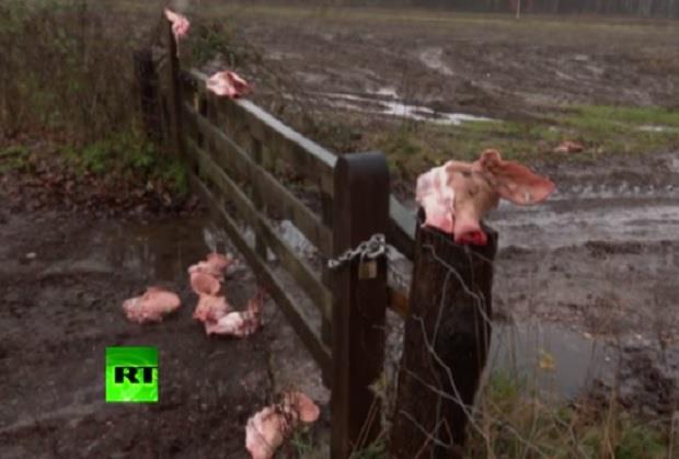 Devet svinjskih glava "ukrašavalo" je ogradu, a ostale su bile pobacane uz ogradu i po putu. Sliku su upotpunjavale kese pune svinjske krvi, ostavljene uz ovu "dekoraciju".