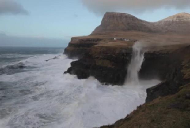 Extreme weather conditions hit the Faroe Islands and caused a waterfall to apparently move upwards on Saturday. The bizarre sight came as heavy winds and waves hit Gásadalur, a settlement on the coast of the Faroe Islands.