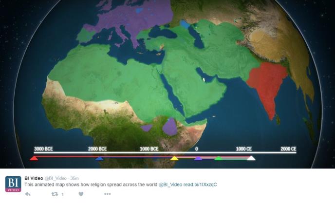 Kratki film o širenju najvećih religija kroz vekove i značajnim događajima koji su se desili u vezi sa njima, objavljen je je na portalu "Biznis insajdera" a pokazuje da se islam širio najbrže od svih religija koje su nastajale.