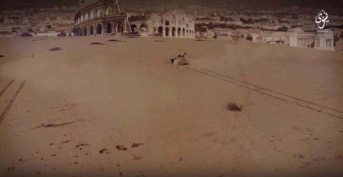 U digitalno izmenjenom snimku se takođe vidi oklopno vozilo IS kako se kreće prema Koloseumu, a muški glas koji čita tekst kaže da će militanti uništiti "krstaška mesta".