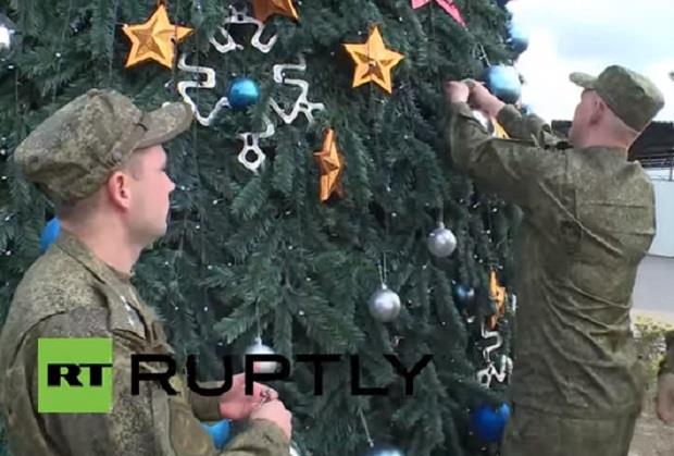 Snimak priprema za proslavu Nove godine napravljen je u ruskoj vojnoj bazi Hmejmim u Siriji.