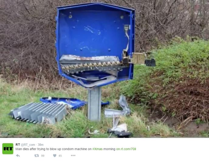 Nemačka policija saopštila je danas da je jedan muškarac poginuo pošto je zajedno s dva prijatelja razneo aparat sa kondomima posle čega ga je u glavu pogodio komad metala.
