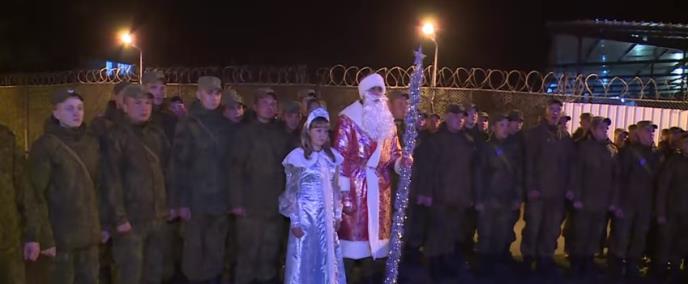 Jelka od 15 metara sa lampicama bila je dopremljena avionom iz Moskve, a vojnici su obraćanje ministra odbrane dočekali uz poklič „ura“.