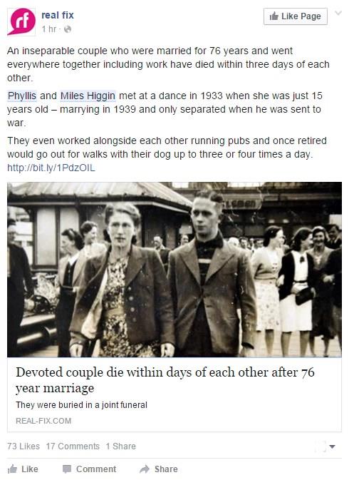 Naime, gospođa Filis Higin (97) umrla je 17. decembra, samo tri dana pre njenog supruga Majlsa (99).