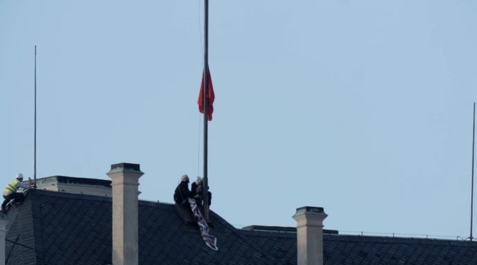 Trojica umetnika iz te poznate, kontroverzne grupe prerušili su se u dimničare, iskoristili skele, pošto se deo zamka Hradčani - sedišta predsednika Češke renovirao, neopaženo su se popeli na krov, ukrali predsedničku zastavu i na taj jarbol na pola koplja okačili ogromne crvene gaće.