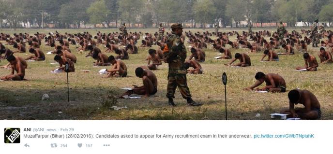 Mediji su objavili fotografije u indijskom gradu Muzafarpur koji prikazuju gomilu mladića koji na jednoj livadi sede u gaćama, prilikom polaganja vojnog ispita.