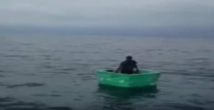 Na desetak kilometara od kopna spazili su jednog čoveka koji plovio sam samcat u plastičnoj kutiji. Kako je tu dospeo nikome nije bilo jasno.