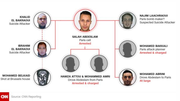 Centralna ličnost ćelije koja je napala Pariz i Brisel je Salah Abdeslam, glavni organizator terorističkih napada u Parizu, uhapšen u Briselu. S njim su povezani i Nadžim Lahraui, za kog se zna da je učestvovao u bombaškim napadima u Parizu i da se razneo u samoubilačkom napadu na briselskom aerodromu, kao i braća El Bakraui, koji su izveli napade na aerodromu u Briselu (Ibrahim) i u metrou (Kalid).