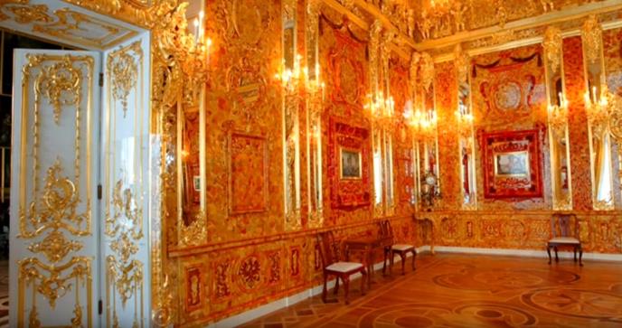 Ćilibarska soba je optočena je ćilibarom i zlatom, a prvobitno je bila sagrađena za palatu kraljice Katarine u Sankt Petersburgu.