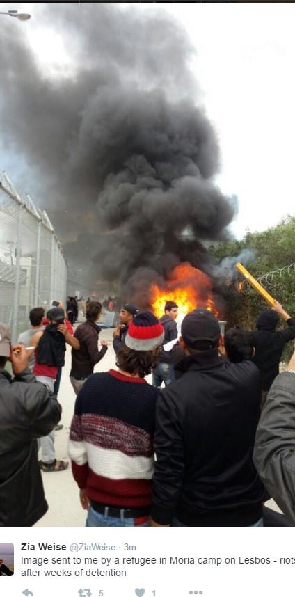 Sudeći po fotografijama sa Tvitera, u kampu je izbio požar. Protest je počeo jer je navodno policajac udario jedno dete.