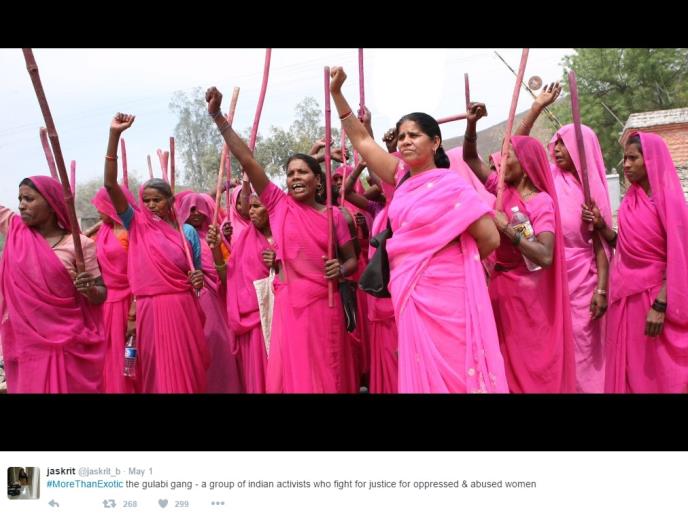 Sampat Devi Pal je moć štapa otkrila još osamdesetih godina kada je njen komšija zlostavljao svoju suprugu. Ona se s njim potom suočila i pretukla ga štapom. Posle toga je osnovala Ružičastu bandu.