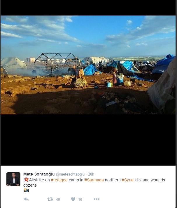 "Sudeći po prirodi razaranja koja se vidi na fotografijama i video zapisima, kamp je najverovatnije, namerno ili greškom pogođen iz više raketnih bacača , koji danas često koriste teroristi Al Nusre na tom području" ,rekao je general Igor Konašenkov.