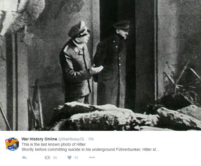 Neposredno pre nego što je počinio samoubistvo u svom bunkeru "Vučja jazbina", Hitler je izašao napolje sa SS oficirom za ispitivanje štete od bombi savezničkih snaga.