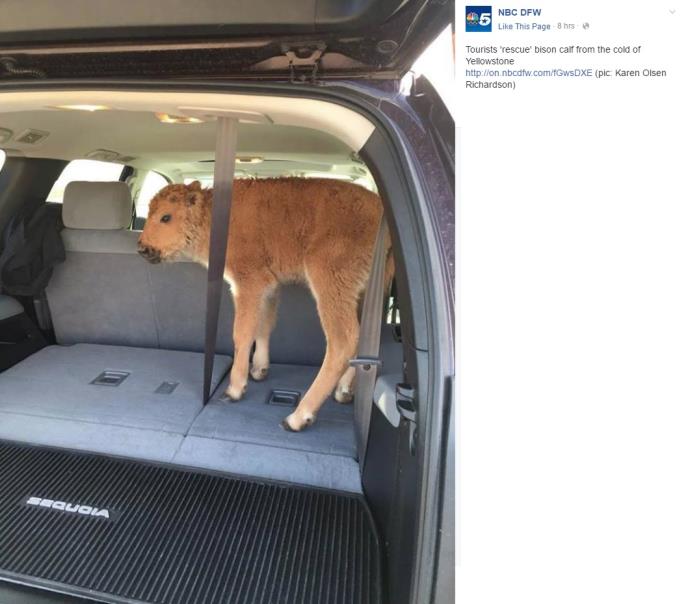 U nacionalnom parku Jelouston turisti stalno pokušavaju da dođu u kontakt sa divljim životinjama, a to pokazuje i jedan poprilično neobičan slučaj. Naime, otac i sin došli su na ranč bizona Lamar u Vajomingu s mladunčetom bizona na zadnjem jedištu svog SUV-a.