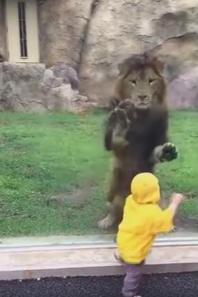 Na sreću, lav je samo završio "prilepljen" za bezbednosno staklo a dečak se u trenutku "napada" samo okrenuo da pogleda veliku mačku kako šapama udara po staklu.