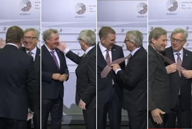 Još na samom početku snimka vidi se da se Žan-Klod Junker čudno drži i da je trešten pijan, a kad počne da šamara i vuče za kravate prisutne ministre zemalja članica EU, šefove država i diplomate, koji dolaze da poziraju s njim, sve je potpuno jasno.