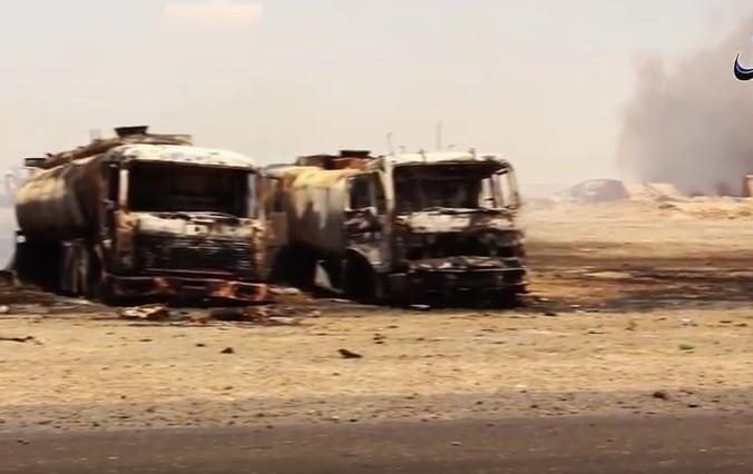 Islamska država objavila je snimak spaljenog naftnog konvoja na nenaseljenom punktu Mansuri, zapadno od Rake.