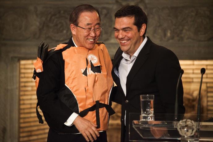Grčki premijer Aleksis Cipras poklonio je tom prilikom Banu narandžasti prsluk za spasavanje, koji je prvi čovek UN-a nakratko obukao, ali naopako, prenela je agencija AP.