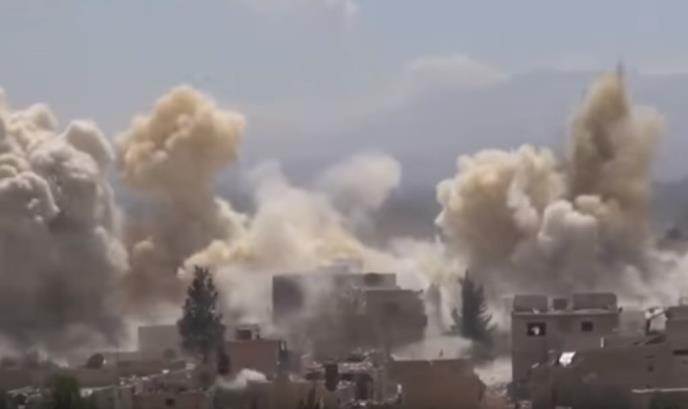 Na novom snimku žestokih vazdušnih udara sirijskih snaga, čitavi gradski kvartovi nestaju ispred naših očiju.