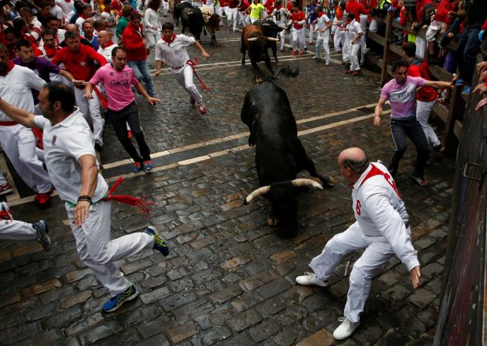 Jedan od šest bikova, koliko ih je učestvovalo u trci, zaleteo se u grupu učesnika trke i probo Amerikanca u butinu, a još dva muškarca je rogovima bacio u vazduh, prenela je agencija AP.