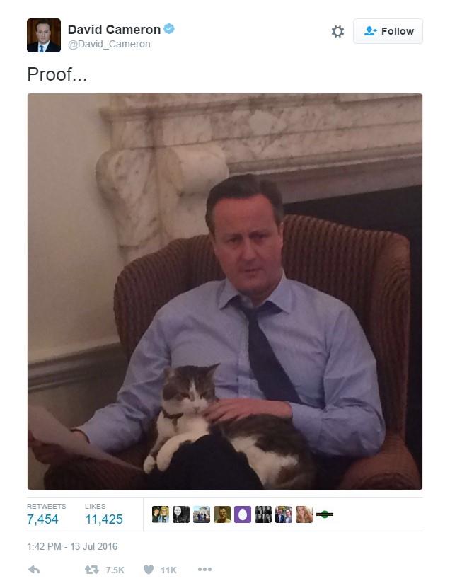 Kameron je novinarima pokazao fotografiju na kojoj mazi Larija sedeći na jednoj fotelji u rezidenciji.
