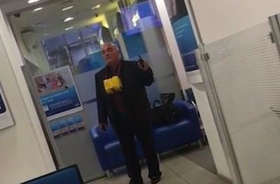 Oko vrata mu je vislila kutija iz koje su virile žice, navodi Tas. Takođe, ruska agencija prenosi da je on napomenuo da njegova akcija nije uperena protiv banke i da nije tu došao zbog pljačke. Prema rečima jednog očevica, napadač je vikao da je bankrotirao.